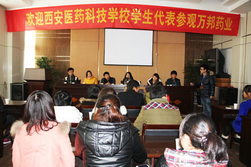 2013年1月8日下午,西安醫(yī)藥科技學(xué)校的30多名畢業(yè)生在4名在校老師的帶領(lǐng)下來萬邦藥業(yè)參觀。負責(zé)公司行政工作的戴總、公司人力資源部總經(jīng)理徐小強和人力資源部主管朱曉杰等部門負責(zé)人參加了接待工作。