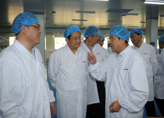 毛光烈副省長(右)對萬邦藥業(yè)現(xiàn)代化的設(shè)備表示贊許